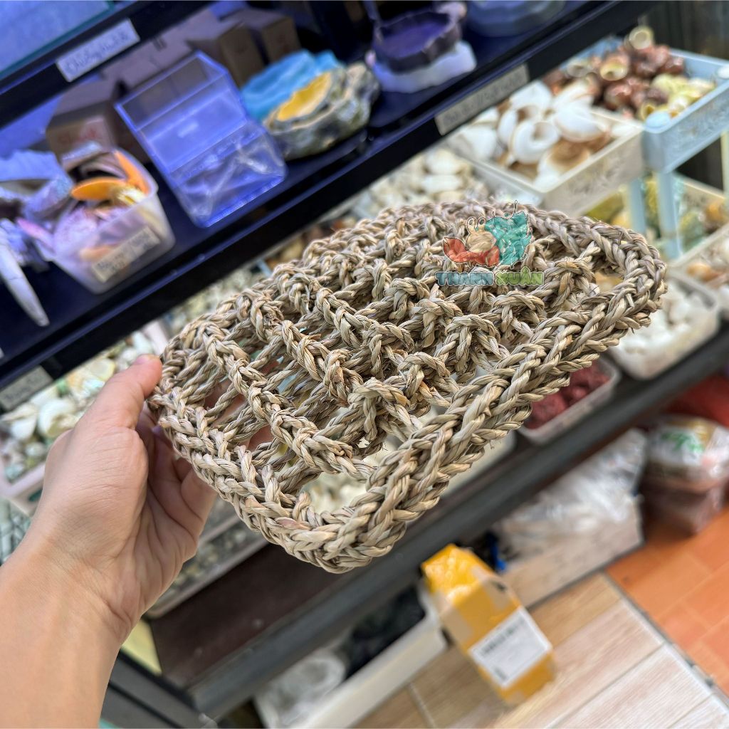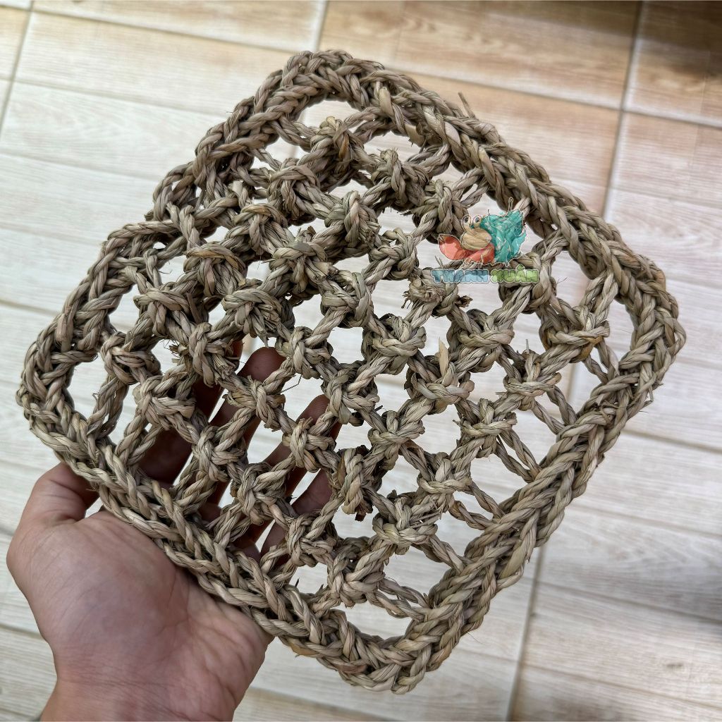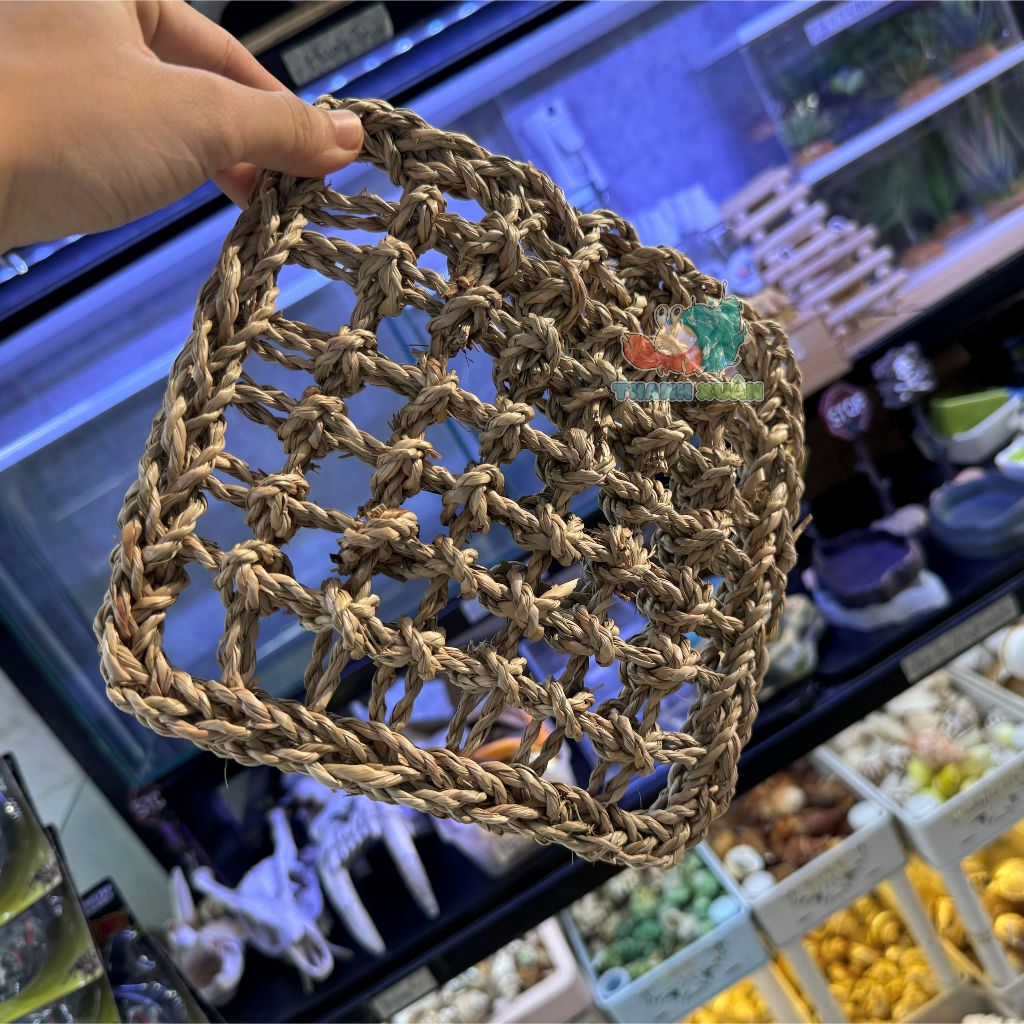 Tấm lưới cói làm hang trú và làm võng ngủ cho thú cưng nhỏ~Màu sắc : vàng nâu ~Kích thước : 18X18X2CM~có thể thay đổi dạng dài hoặc tròn bằng cách buộc dây thít nhựa hoặc dây thừng ~có thể treo trên cao bằng dây thừng ~Công dụng : – Trang trí chuồng nuôi – võng ngủ cho bò sát – Làm đồ chơi leo trèo cho ốc mượn hồn